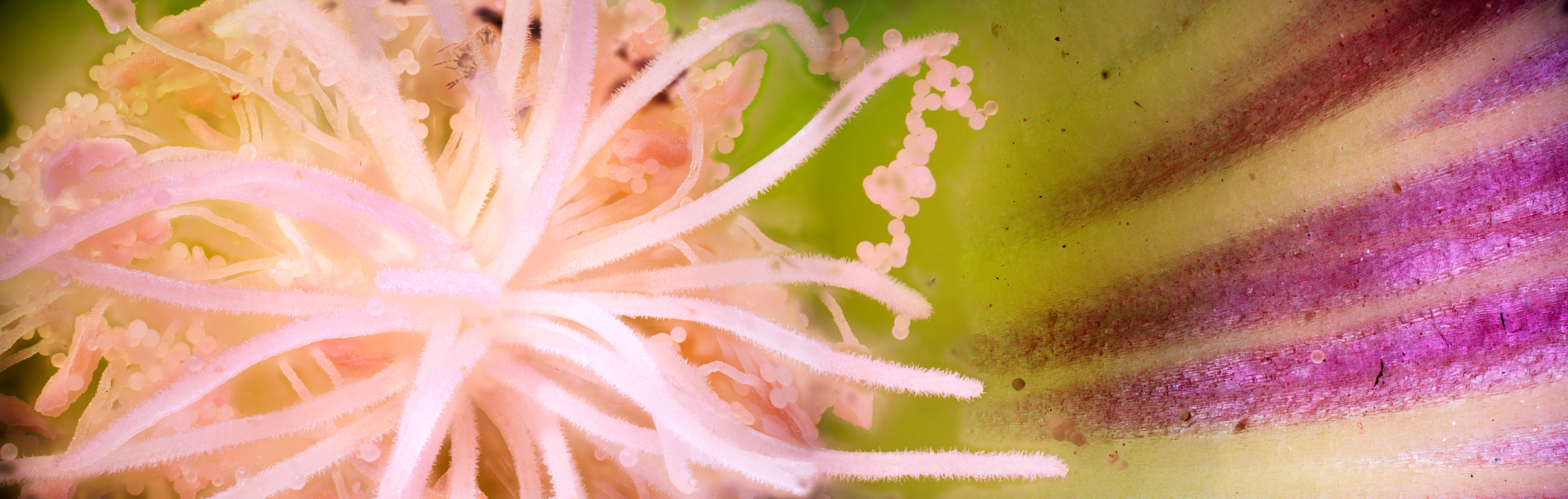Insects and flowers photographed through a 4x microscope objective attached to a camera. Because the objective's depth of field is so narrow, the camera had to be mounted to a focus stacking rig, which takes a series of 100-200 photos, moving a tiny amount closer to the subject each time. I then combined these photos in a focus stacking software to create each final image.